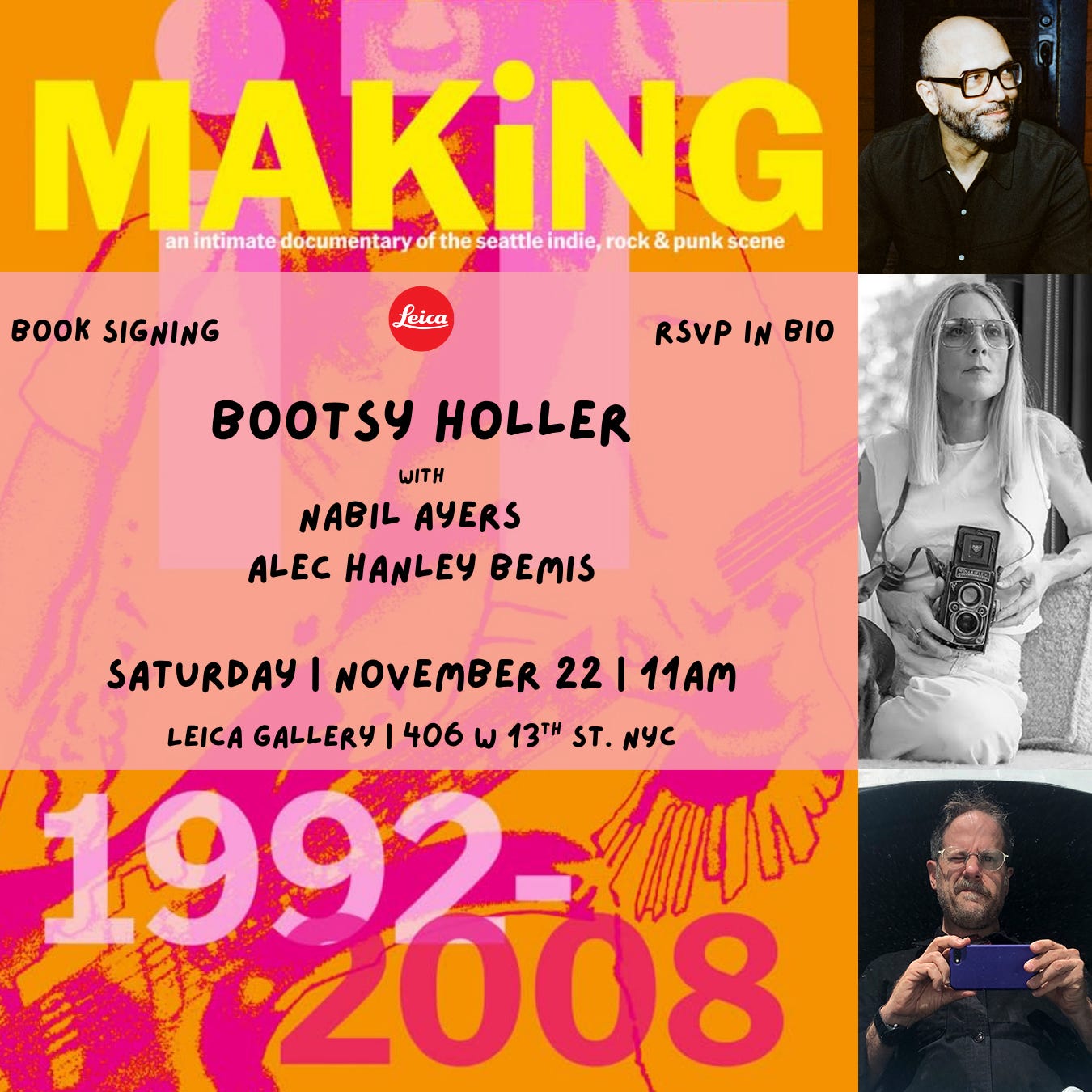 • Bootsy Holler’s Making It: I’ll be co-hosting a launch event for my friend Bootsy’s new photo book, which is subtitled “an intimate documentary of the Seattle indie, rock & punk scene.” We’ll be chatting-in-public at 11am this Saturday November 22 at Leica Gallery, 406 W. 13th St, Manhattan, NYC (map).